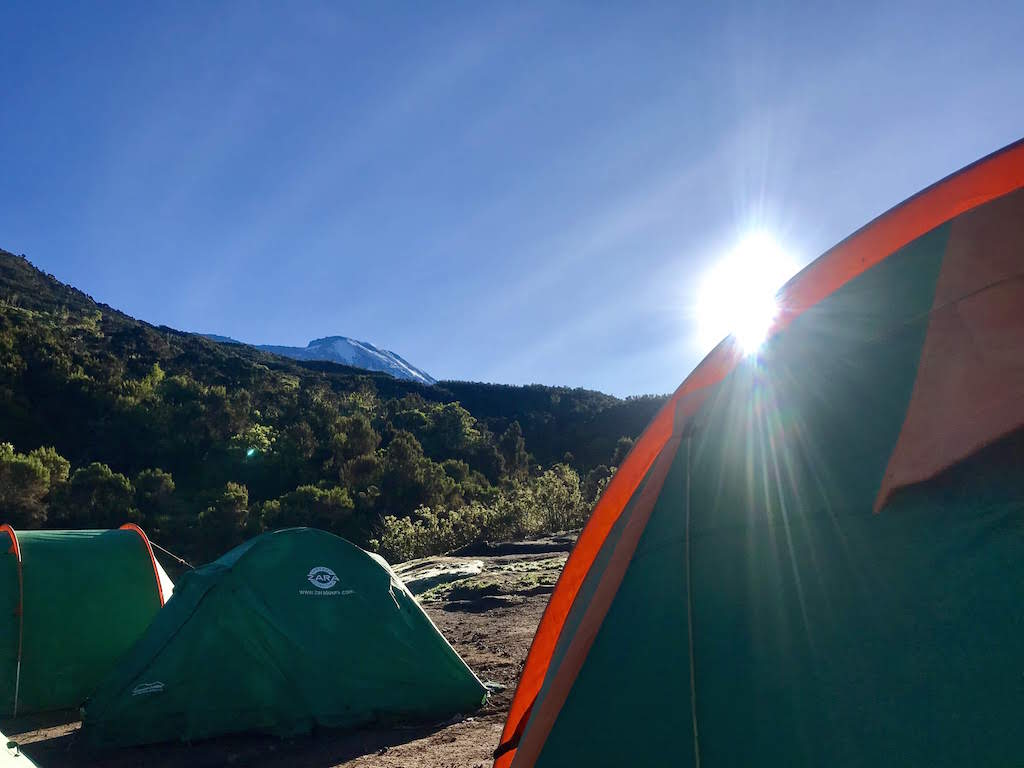 Strahlend blauer Himmel begrüßt jeden Tag. Nachdem ich mich aus meinem Schlafsack geschält habe und aus dem Zelt luge, erblicke ich täglich direkt vor mir – beinahe zum Greifen nahe – den Kilimandscharo.